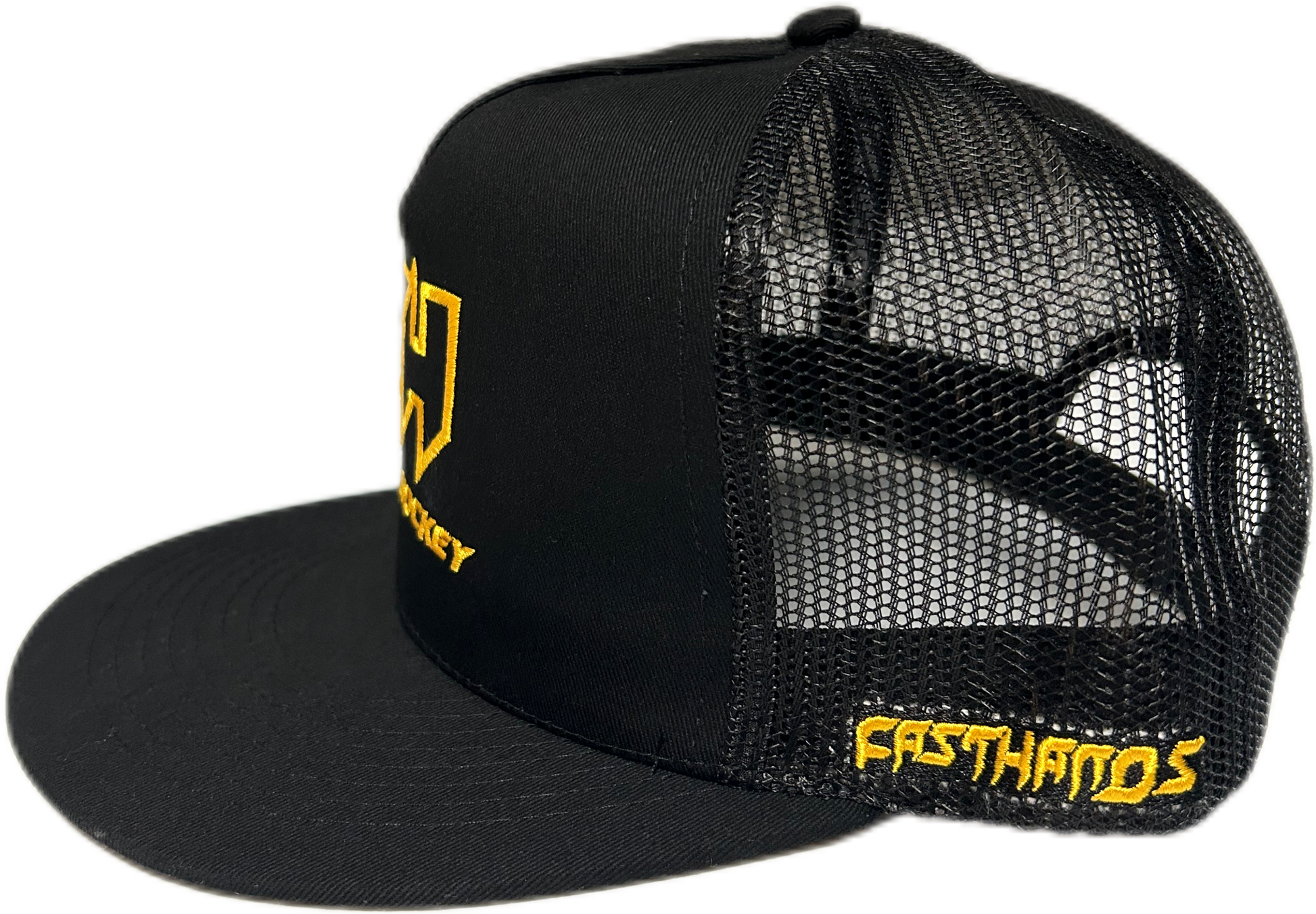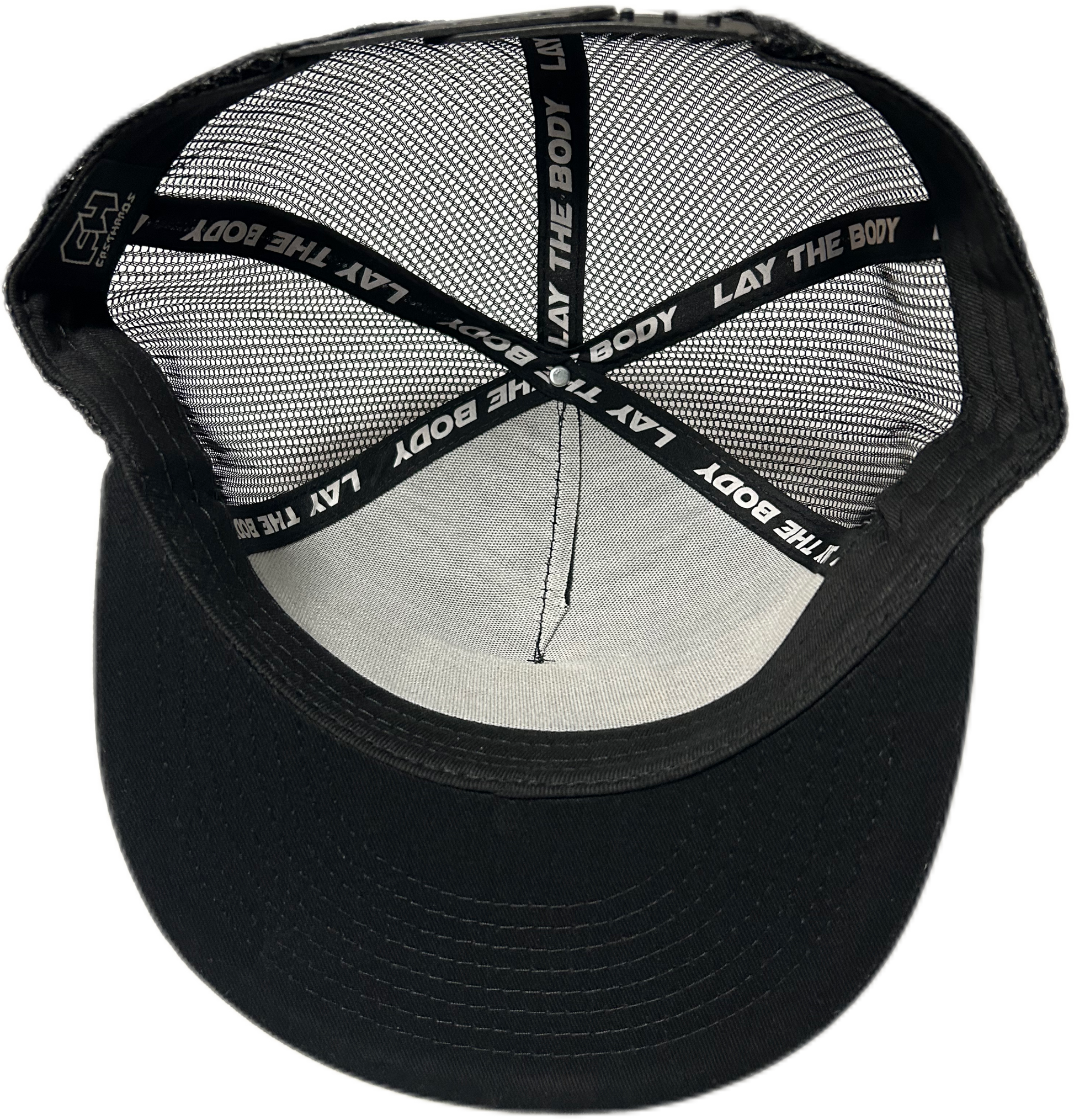 The hat that started it all. Inspired by a local junior hockey teams championship run, this classic black and yellow 5 panel mesh-back fits all with a flat brim. Inner tape Message "Lay the Body" reminds you of your job on the ice. You can now send a message as you stand out at the rink.